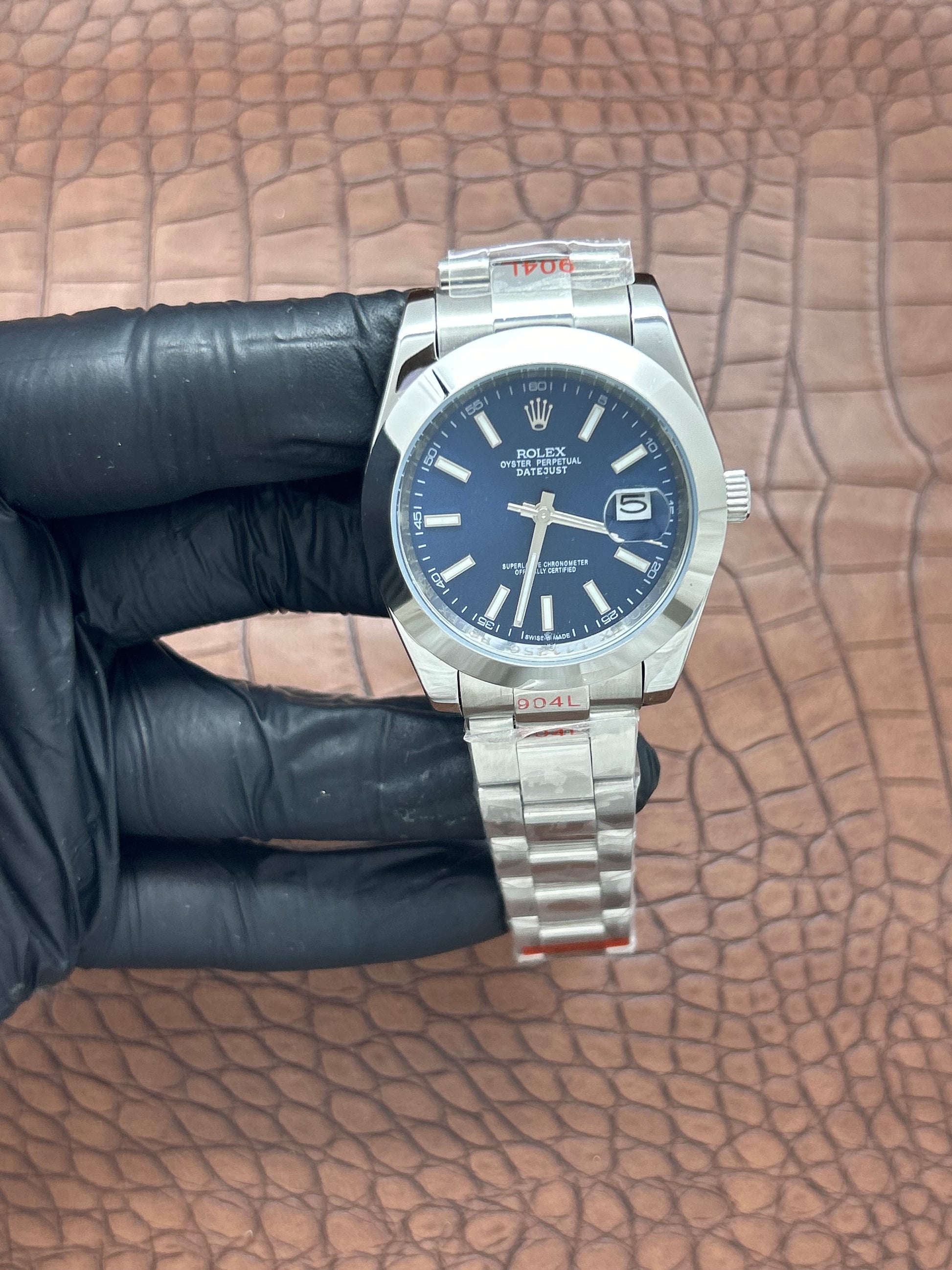 Il D A T E J U S T presenta una cassa di 41 mm realizzata in acciaio inossidabile 904L, noto per la sua resistenza alla corrosione. Dotato di movimento automatico, offre precisione e affidabilità. Il vetro antigraffio logato garantisce una visibilità chiara e duratura, riducendo la necessità di sostituzioni frequenti.