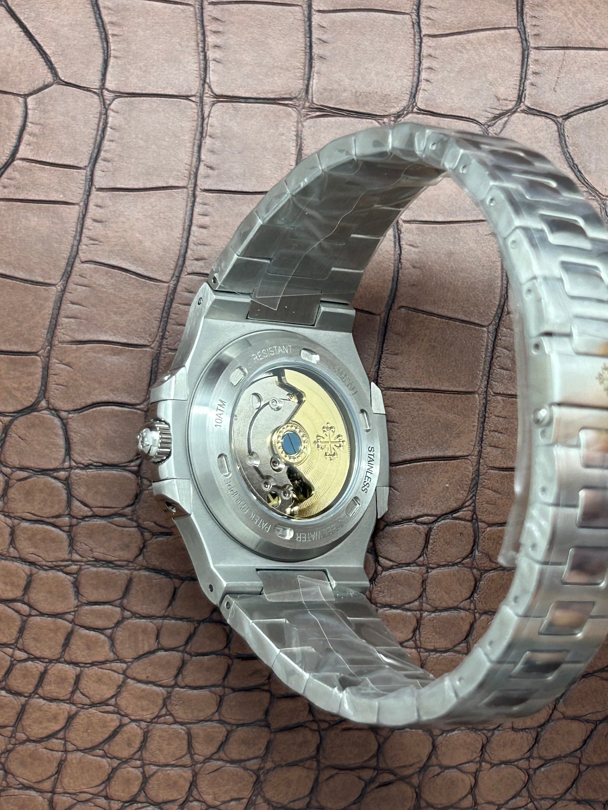 Il PP è un orologio raffinato in acciaio inossidabile con un movimento automatico visibile, che assicura precisione e durata. Il fondo blu e gli indici luminescenti migliorano la leggibilità in condizioni di scarsa illuminazione. La resistenza all'acqua e il vetro antigraffio garantiscono una protezione efficace contro eventi quotidiani.Fatto totalmente in acciaio inossidabile