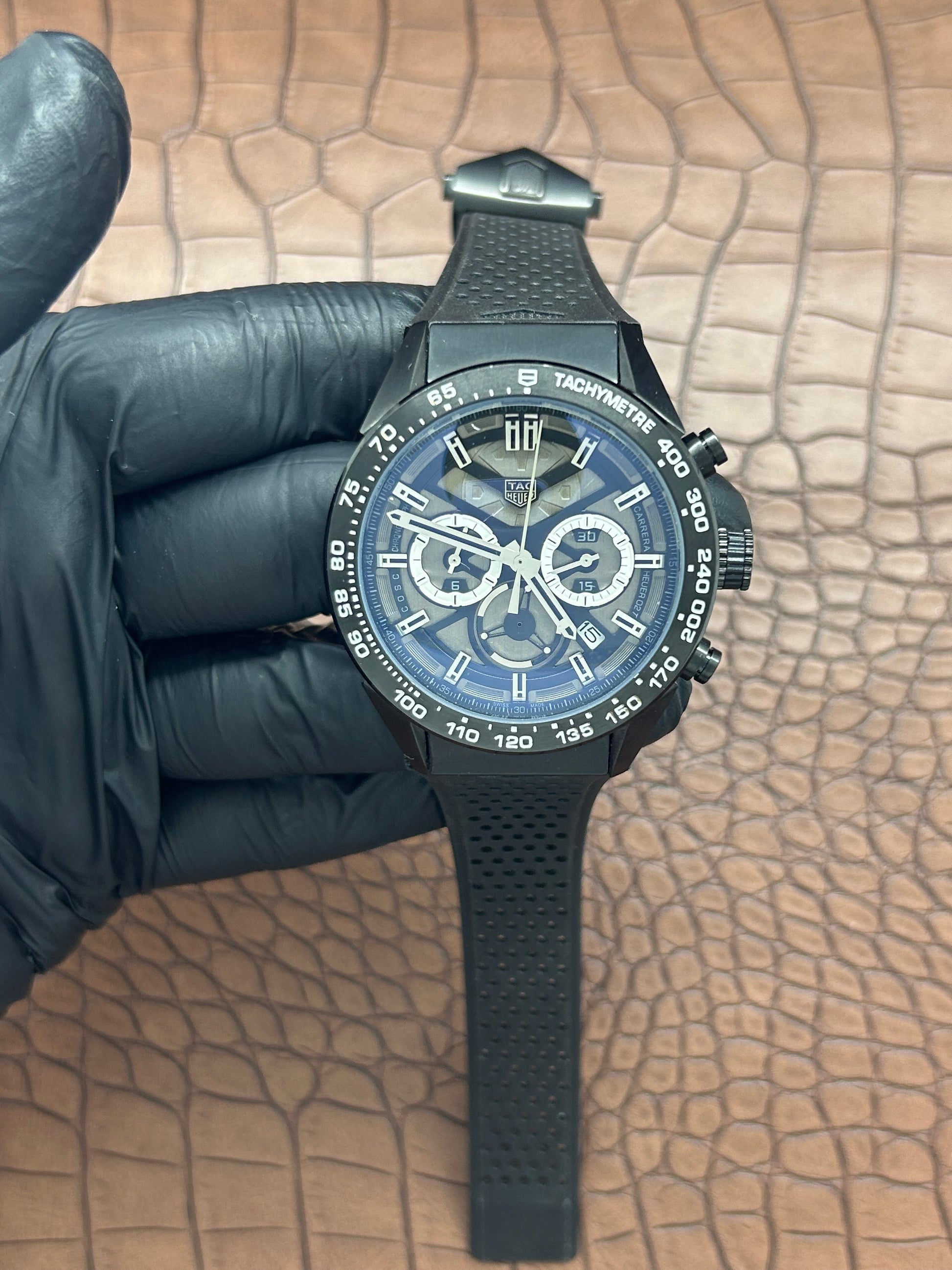 Il Tag Carrera presenta una cassa in acciaio nero 904L, noto per la sua eccezionale resistenza alla corrosione. Il quadrante offre un’illustrazione dettagliata della qualità del prodotto , evidenziando la precisione ingegneristica. Il bracciale in gomma garantisce comfort e adattabilità. Questa referenza è rarissima, rendendo il pezzo un investimento esclusivo.
